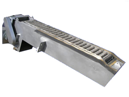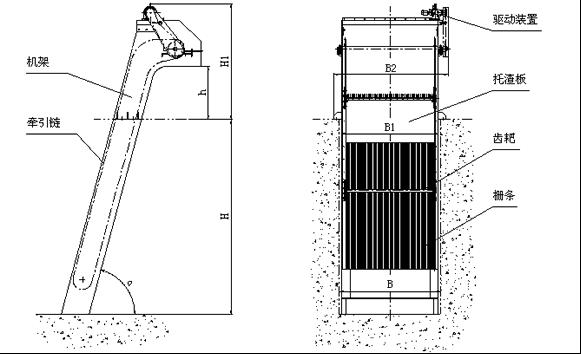在電動(dòng)機(jī)的驅(qū)動(dòng)下,通過(guò)減速機(jī)減速后,帶動(dòng)鏈輪及鏈條運(yùn)動(dòng),固定在回轉(zhuǎn)鏈條上除污齒耙鏈條在柵后運(yùn)動(dòng)到底部,經(jīng)過(guò)導(dǎo)輪后翻轉(zhuǎn)到柵前迎水面的位置繼續(xù)運(yùn)動(dòng)插入固定柵條的間隙中上行,把柵前攔截的污物帶出水面,并隨著鏈條的運(yùn)動(dòng)到出渣口處自動(dòng)翻轉(zhuǎn),污物自卸到格柵后的輸送機(jī)或渣桶中,完成排污過(guò)程,液體則通過(guò)柵條的柵隙流過(guò),整個(gè)工作狀態(tài)連續(xù)循環(huán)進(jìn)行。