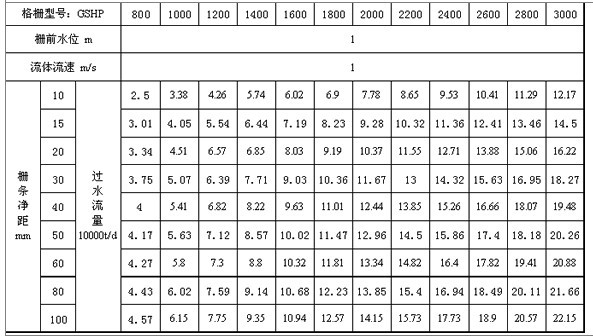 回轉(zhuǎn)耙式格柵過(guò)水流量表: